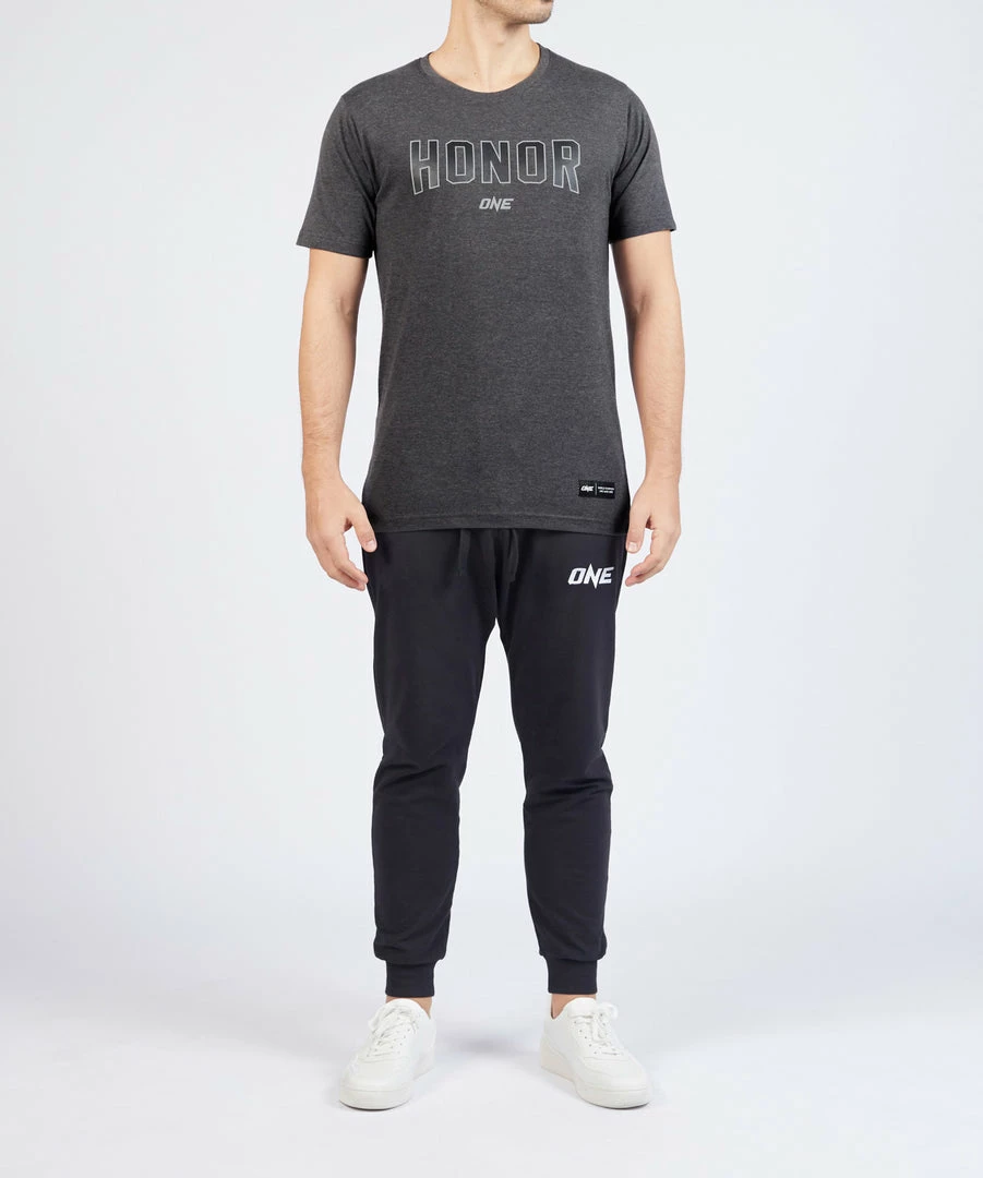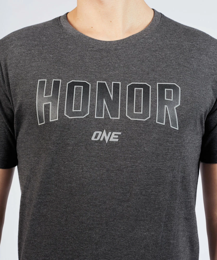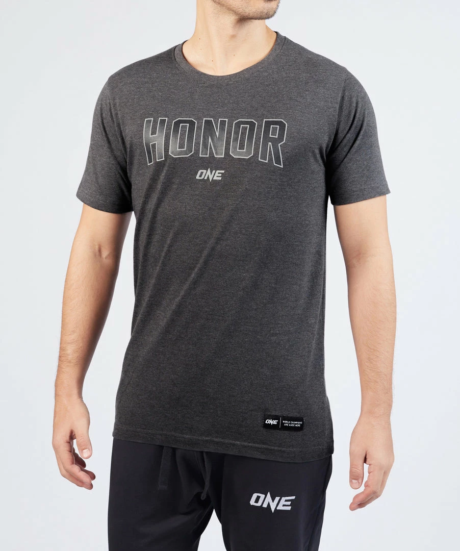 The Honor Tee features one of the hallmark values of martial arts and of ONE Championship. Against a classic dark heather gray t-shirt, the word ‘Honor’ is displayed in specially designed typography and is outlined in high density ink for a crisp 3D feel. The Honor Tee is finished with our multilingual “The Home of Martial Arts” woven necktape and has a screen printed inner neck label for added comfort.