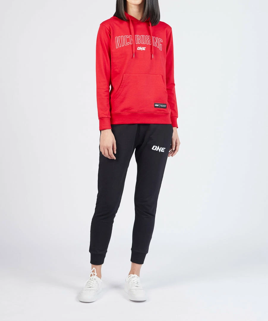 The Kickboxing Graphic Hoodie features specially designed typography across the front of the chest on a custom dye red fabric. The back of the t-shirt features a sharp kickboxing silhouette with a slightly distressed application. The Kickboxing Graphic Hoodie is finished with a multilingual “The Home of Martial Arts” woven necktape and has a screen printed inner neck label for added comfort.