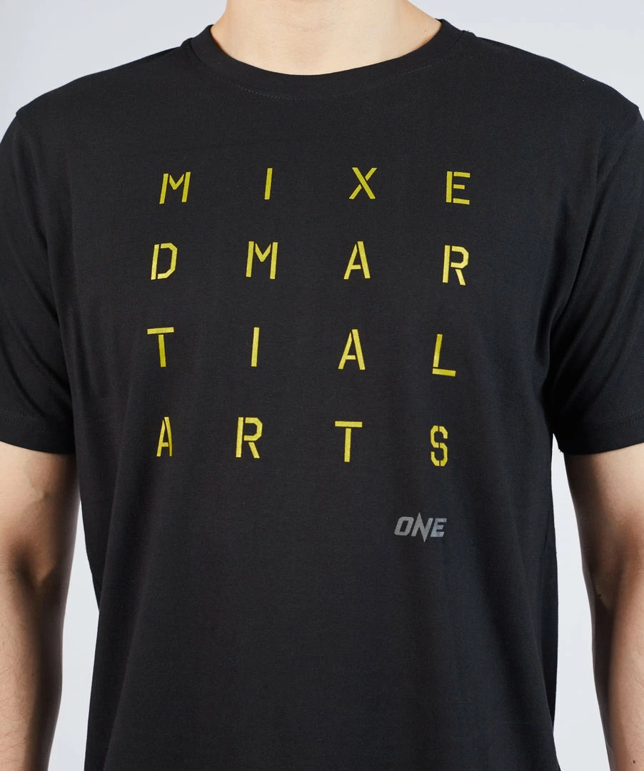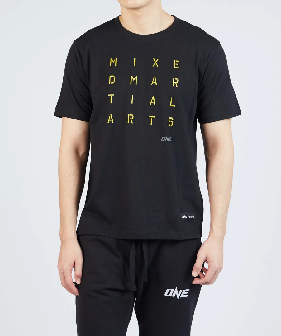 For all MMA fans and practitioners, the Mixed Martial Arts Typography Tee features sleek stacked typography art in bright yellow against a classic black t-shirt. It is finished with a multilingual “The Home of Martial Arts” woven necktape and has a screen printed inner neck label for comfort.