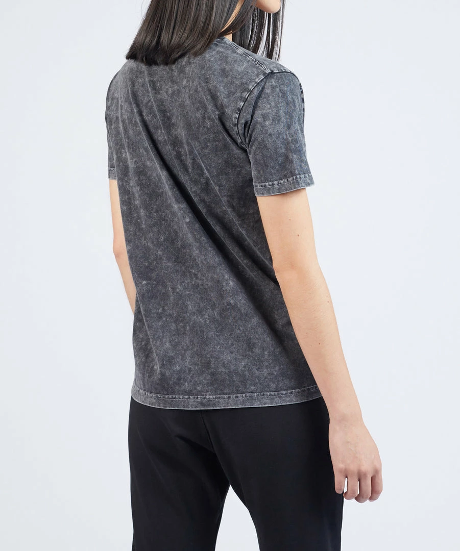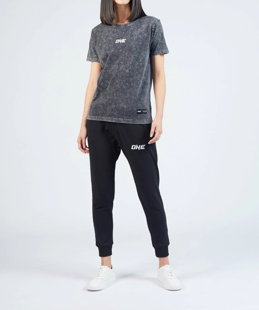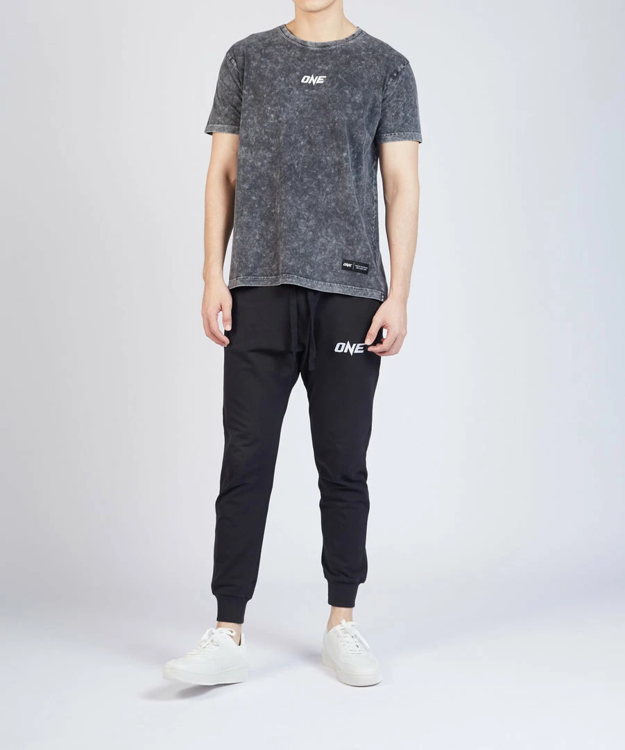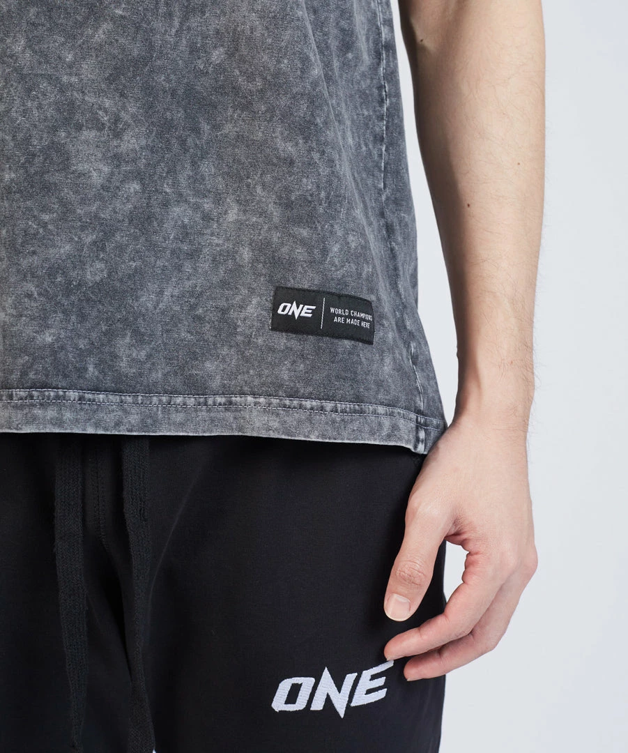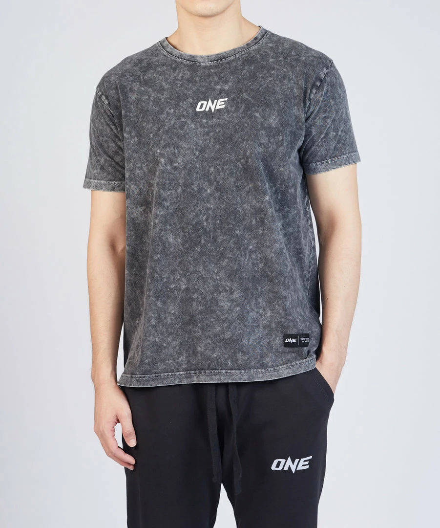 The ONE Signature Logo Stonewashed Tee features a white ONE logo screen tastefully printed on the center of a vintage stonewashed gray tee. The tee is finished with our multilingual “The Home of Martial Arts” woven necktape and has a screen printed inner neck label for added comfort.