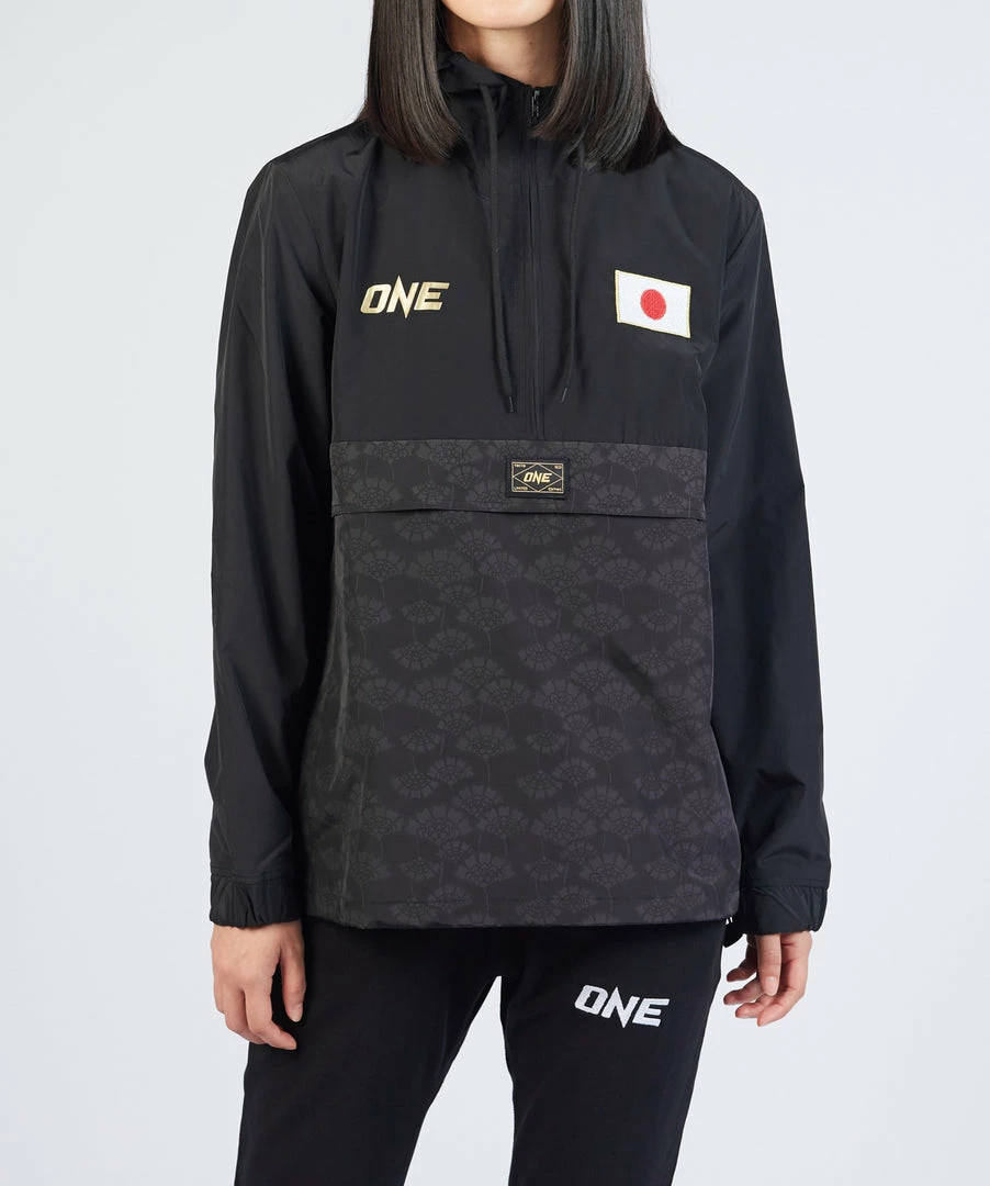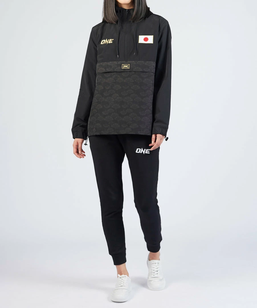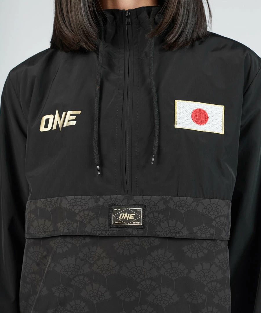 Our ONE Tokyo Anorak Jacket is perfect for keeping you warm in the fall. The water-resistant outer layer features the ONE logo in gold, an embroidered Japanese flag, and our specially designed Japanese lotus print.
