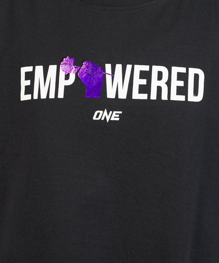 ONE celebrates International Women’s Day with the Empowered Crop Tee, featuring the word ‘Empowered’ and a purple fist holding a rose, representing the unrivalled strength of women. This stylish piece features a relaxed and roomy fit and a cropped hem. The tee is finished with a multilingual “The Home of Martial Arts” woven necktape and has a screen printed inner neck label for comfort.